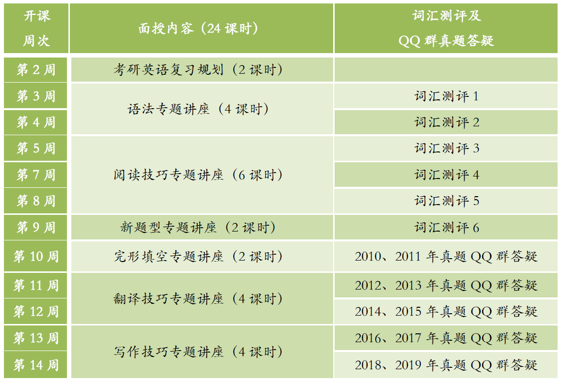 我们的辅导包括面授、词汇测评及QQ群真题答疑三个部分,其中面授课程24课时,包括复习规划、语法、阅读、新题型、完形填空、翻译和写作七部分,夯实大家英语基础、覆盖考研英语全部题型。开课时间为2019年春季学期2-14周周六9:00-11:00,具体安排如下: