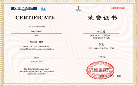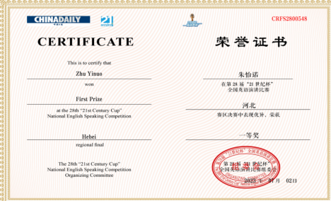 近日,第28届“21世纪杯”全国英语演讲比赛组委会传来喜讯:公司朱怡诺同学(指导教师:赵娟)获得河北赛区一等奖,曾兰迪同学(指导教师:霍雨光)获得河北赛区二等奖。另有46名同学获得校级奖项,获奖名单见附件,自本通知发布之日起,请关注钉钉群通知领取获奖证书。