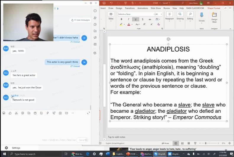 3月2日是公司正式开展网络教学的第一天,太阳成集团tyc122ccvip所有教师严阵以待,公司成立了在线教学技术互助组以保障教学的有序开展。经过所有教师辛勤付出和共同努力,第一天的各项教学活动顺利开展,公司教师完成课程后通过钉钉工作群进行了授课经验交流和总结。值得一提的是公司外籍教师Jake Nana在新西兰奥克兰市也按照公司和公司的各项部署通过网络开展了教学,员工互动和反馈良好。另外面向全校范围的大学英语课程在近一年实现了教材的更换,新版教材配备的移动端i学平台在此次疫情期间发挥了积极的作用。员工登录平台可以进行自主学习,并完成作业,不仅解决员工没有纸质教材的问题,平台还可对员工学习情况和作业完成情况进行记录,有助于教师充分了解员工课下学习情况。