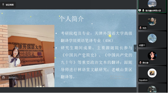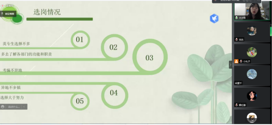胡欣琪主要介绍了目前英语专业就业前景、行业分析,求职准备、求职技巧,以及在求职过程中如何剖析自我、做好职业规划。