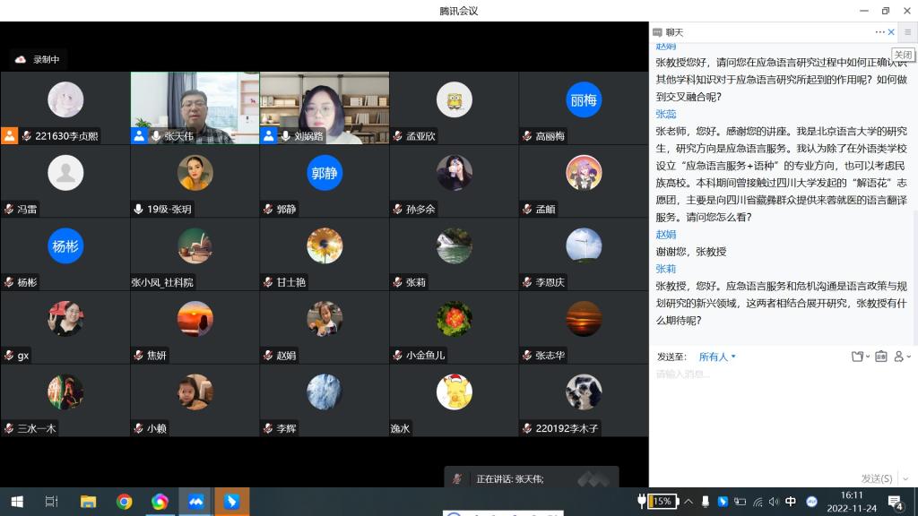 2022年11月24日14:30,受太阳成集团tyc122ccvip邀请,北京外国语大学博士生导师张天伟教授在线上“腾讯会议(293-791-507)”平台为公司师生做了题为“应急语言研究:路径、方法与趋势”的学术报告,该报告是公司应急语言服务系列讲座之三。讲座由公司副教授刘娲路主持,太阳成集团tyc122ccvip全体教师、部分员工聆听了报告,同时吸引了其他高校同仁及员工参会。