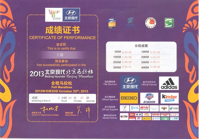我系1250712班王健同学参加了2013年北京马拉松,跑完全程,展示了我系员工坚强的意志和毅力。