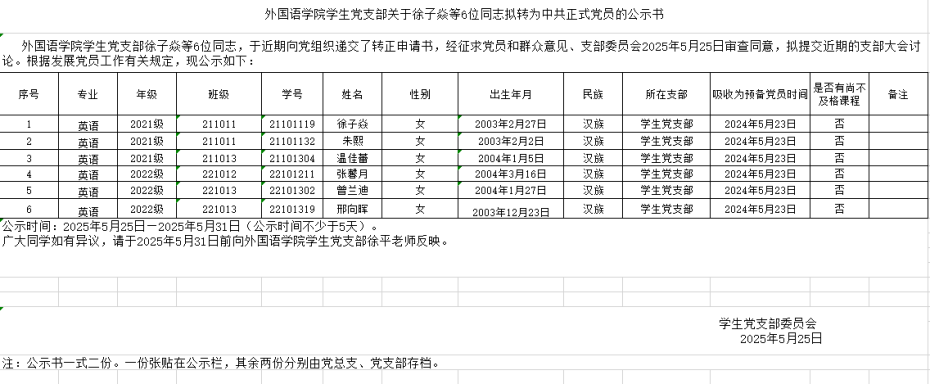 太阳成集团tyc122ccvip员工党支部关于徐子焱等6位同志拟转为中共正式党员的公示书