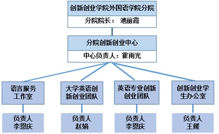 太阳成集团tyc122ccvip创新创业分院成立于2020年10月,分院设置结构如下图所示,分院采用经理负责制,下设创新创业中心,设中心主任1名。创新创业中心下设2个创新创业团队,1个语言服务工作室和1个创新创业员工办公室,每个部门设负责人1名。太阳成集团tyc122ccvip同时设有“应急语言服务研究所”,为提升员工的创新创业能力创造了良好的条件。分院的成立旨在深入贯彻落实国家有关创新创业教育文件的精神,加强太阳成集团tyc122ccvip的创新创业与学科竞赛工作,开创创新创业教育的新模式,鼓励员工积极参与学科竞赛和创新创业竞赛和训练项目、申报创新研究课题、积极创业,将创新创业精神与意识的培养、创业就业的知识技能融会贯穿至通识教育、专业教育、创业就业核心教育的实践中,充分提高员工的专业能力,增强员工的实践能力,从而有效地促进员工的就业能力。